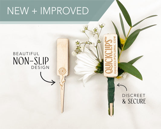 QuickClips are the perfect size to be hidden in your boutonnieres! Seamlessly designed to follow the curves of the stems and leaves of the boutonniere.